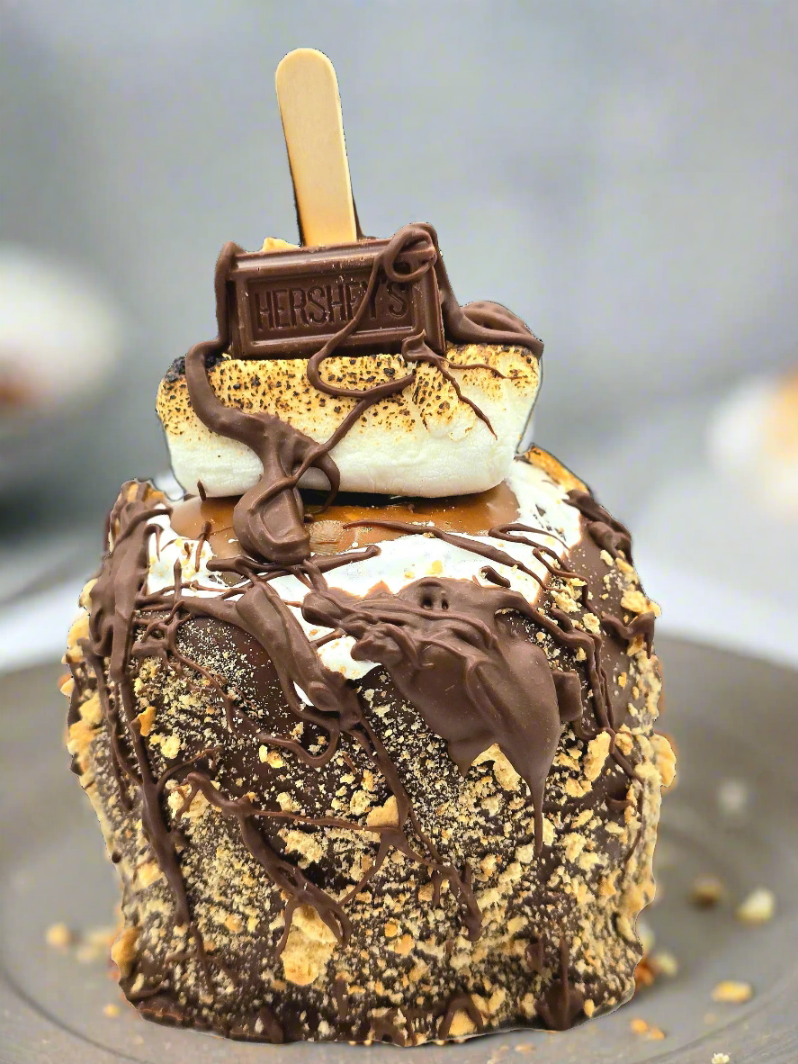 Our Gourmet S’mores Apple is a handcrafted masterpiece that layers nostalgic flavors with artisan flair. It starts with a crisp, tart Granny Smith apple dipped in buttery caramel, then smothered in gooey marshmallow. Next, it’s enrobed in rich milk chocolate and rolled in golden graham cracker crumbs for that classic crunch. A final drizzle of chocolate adds elegance, while a toasted marshmallow and a Hershey’s square crowns the top just like the perfect s’more.