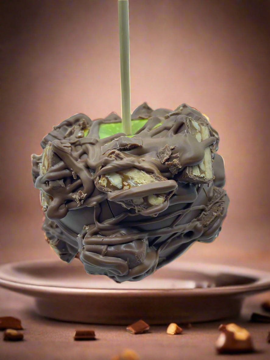 Our Snickers Apple is a bold fusion of crisp fruit and candy bar decadence. It starts with a fresh Granny Smith apple dipped in buttery caramel, then smothered in rich milk chocolate. Chunks of real Snickers® bars are pressed into the coating, and a final chocolate drizzle seals the deal. It’s sweet, salty, crunchy, and chewy all in one unforgettable bite.